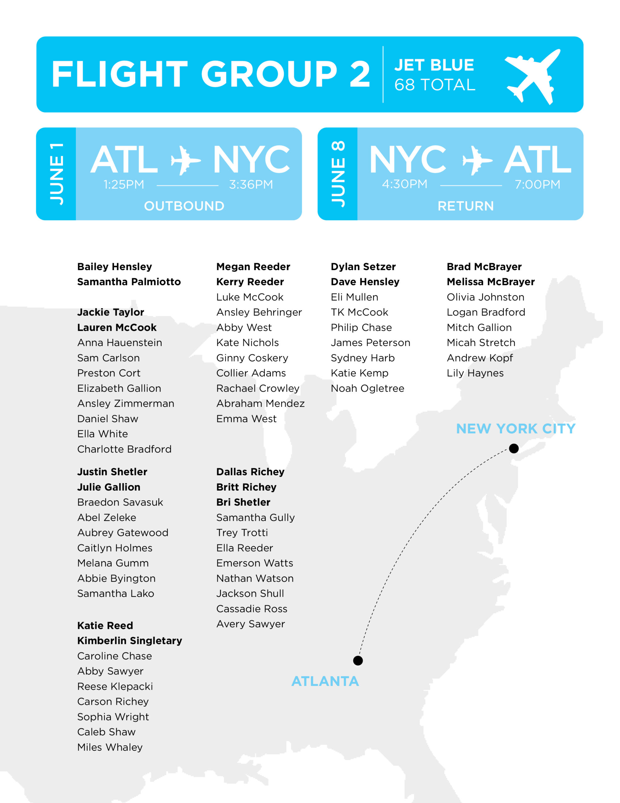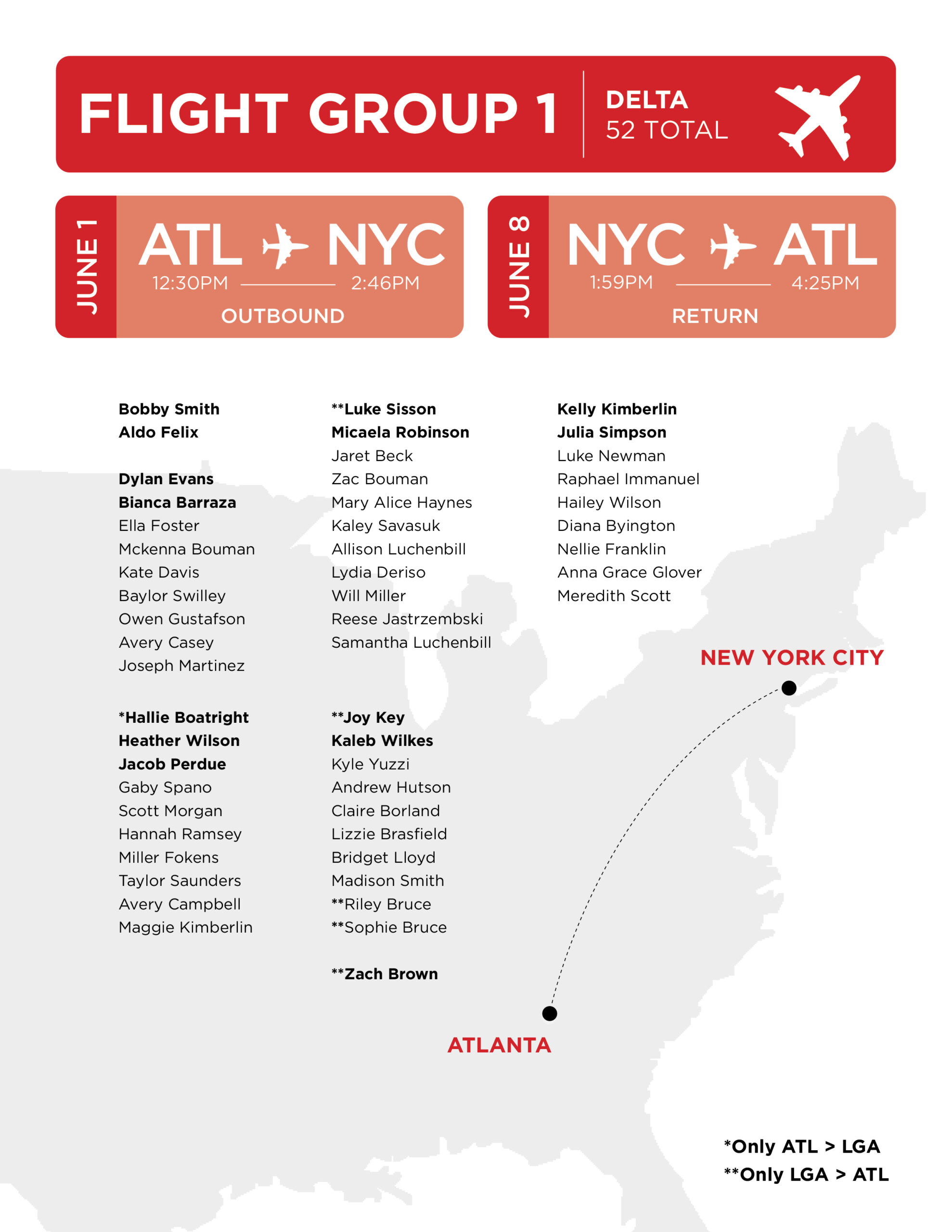 We are very grateful to our friends at Delta and Jet Blue for arranging our flights to New York this year! You can view our flight information below: